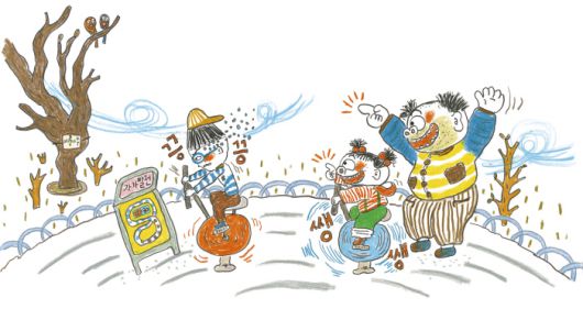 이 유년동화 시리즈는 잘 먹고, 잘 자는 정이와 못 먹고, 못 자는 혁이를 모두 따듯하게 바라본다. 정이에게 혁이처럼 똑똑해지라고, 혁이에게 정이처럼 씩씩해지라고 강요하지 않는다. 정이와 혁이는 다르다. 이 책에서 정이가 아빠를 닮고, 혁이가 엄마를 닮았다고 말하는 건 각자 타고난 바가 있을 뿐 유전자의 우월성 따위는 따지지 않는다는 뜻이다. 그래서 근육량이 많고 면역력이 좋은 정이와 아빠는 겨울에도 공원에 나가 놀고, 근육량을 늘려야 하고 감기에 걸리기 쉬운 혁이와 엄마는 헬스장에 다니기로 한다. “가족이 다 함께 하는 건 소중해”(<나는 따로 할 거야>, 43면)라고 말하던 엄마는 “따로 하는 것도 소중해”(<나는 따로 할 거야>, 54면)라고 바뀐다. 서로 다른 어린이들이 공동체에서 살아가는 법을 보여주는 장면이다.