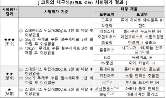 코팅 내구성은 조리면 온도를 200±5℃로 유지하고 스테인리스 뒤집개와 철수세미로 각각 분당 40회의 속도로 3000회를 마찰시켜 금속재의 노출유무를 확인하는 방식으로 ‘우수, 양호, 보통’ 단계로 평가했다.