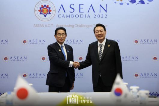 [서울=뉴스핌]윤석열 대통령이 13일 오후 캄보디아 프놈펜의 한 호텔에서 기시다 후미오 일본 총리와 한-일정상회담에 앞서 악수를 하고 있다.[사진=대통령실SNS] 2022.11.13 photo@newspim.com |
