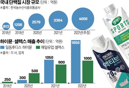 일동후디스가 시장에 뛰어들기 전에 업계 선두는 매일유업의 ‘셀렉스’였다. 2018년 단백질 시장에 뛰어든 매일유업은 2019년 250억 원의 2년 후 900억 원으로 매출이 크게 뛰자, 아예 2021년 셀렉스 담당 헬스앤뉴트리션 판매사업부문을 분할해 독립시켰다.