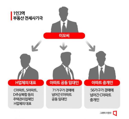 아시아경제가 인천시 미추홀구 전세사기 피해대책위원회로부터 제공받은 피해 아파트의 등기부등본, 임대차계약서, 관리비 고지서 등을 분석한 결과, 임대인으로 이름을 올린 김**씨는 인근 건물을 중개한 계약서에는 중개보조인으로 나와 있었다. O아파트의 주택종합관리업체로 등록된 업체의 대표도 김씨였다. 심지어 경매로 넘어간 C아파트의 H주택관리업체의 대표인 이**씨는 C아파트를 중개할 당시 대리인 역할을 했고 마찬가지로 전세사기로 떠들썩한 E아파트의 계약서에는 임대인으로 나와 있다.
