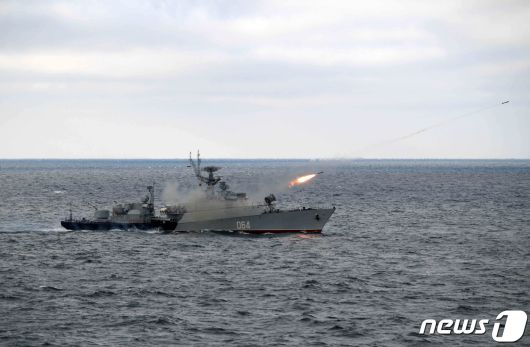 블라디미르 푸틴 러시아 대통령이 참석하고 있는 북부·흑해함대 공동 군사훈련 도중 크림반도 흑해 앞바다에서 대잠초계함 '무로메츠'가 발포하고 있다. 2020.01.09 ⓒ 로이터=뉴스1 ⓒ News1 정윤미 기자 |