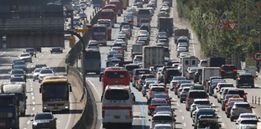 추석 연휴를 하루 앞둔 8일 오전 서울 서초구 경부고속도로 잠원IC 인근 경부고속도로 하행선(오른쪽)이 정체를 빚고 있다. [사진=뉴시스] |