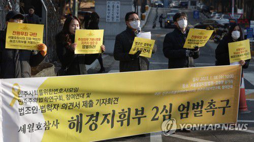 (서울=연합뉴스) 오보람 기자 = 법조인과 시민단체가 세월호 참사 당시 적절한 초동 대응을 하지 않아 승객들을 숨지게 한 혐의로 기소된 전 해양경찰청 지휘부를 엄벌에 처해달라고 법원에 촉구했다.