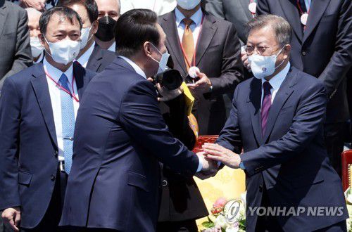문재인 전 대통령과 악수하는 윤석열 대통령 |