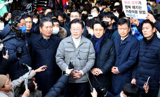 이재명 더불어민주당 대표가 18일 오후 설 명절을 앞두고 서울시 마포구 망원시장을 방문, 취재진의 질문에 답변하고 있다. /국회사진기자단 |