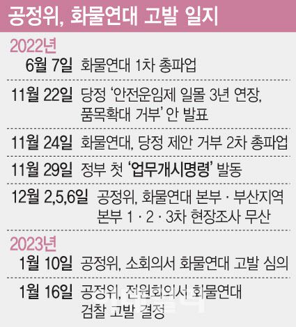 공정위는 현장조사를 통해 화물연대의 인적 구성 등을 면밀히 파악한 뒤, 추후 전원회의에서 단체의 성격과 위법성을 제대로 따져본다는 방침이다. 이번 고발 건과는 별개의 ‘본안 심결’이다. 과징금 등 추가 처분이 내려질 수 있다.