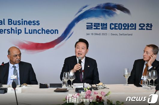 윤석열 대통령이 18일 오후(현지시간) 스위스 다보스의 한 호텔에서 열린 글로벌 CEO들과의 오찬 간담회에서 모두 발언하고 있다. (대통령실 페이스북) 2023.1.19/뉴스1 ⓒ News1 안은나 기자 |