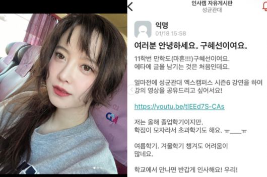 19일 구혜선이 "학우들에게 디엠이 많이 와서 글을 올려요. 에타(에브리타임)에 제가 직접 남긴 글이 맞아요. ㅎ__ㅎ"라며 자신이 직접 남긴 글을 캡쳐했다.