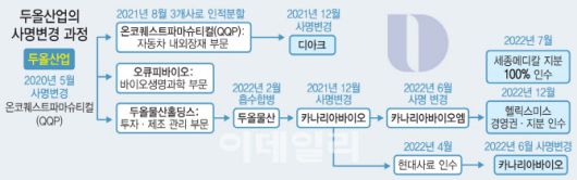 이 때 두올물산홀딩스는 두올산업의 100% 자회사인 두올(016740)물산을 자회사로 들였다. 두올물산홀딩스는 두올물산을 2021년 9월 K-OTC에 상장시킨 후 2021년 12월 카나리아바이오로 사명을 변경시켰다. 2022년 2월에는 두올물산홀딩스가 자회사 카나리아바이오(구 두올물산)을 존속법인으로 하는 합병을 통해 두올물산이 됐다.
