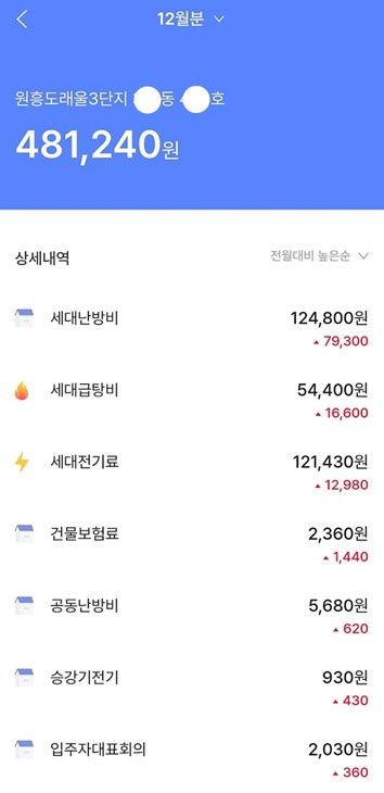 지역 부동산카페와 맘카페에는 '전용면적 84㎡인데 12월분 관리비가 60만원'이라는 게시글부터 '원룸 1인 오피스텔 관리비가 33만원이 나왔다'는 댓글까지 관리비 급등에 대한 우려가 쏟아지고 있다.