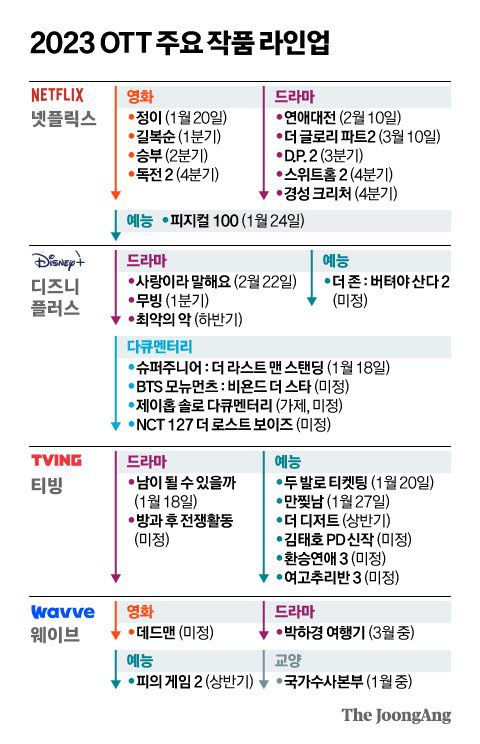 지난해 티빙에게 토종 OTT 선두 자리를 내준 웨이브도 오리지널 시리즈로 반등을 시도한다. SBS에서 ‘그것이 알고싶다’와 ‘당신이 혹하는 사이’ 등 시사교양 프로그램을 연출했던 배정훈 PD가 탐사 다큐멘터리 ‘국가수사본부’(1월 중)로 ‘그알’ 팬들을 공략한다. 2021~2022년 MBC에서 방송됐던 서바이벌 예능 ‘피의 게임’은 상반기 중 두 번째 시즌이 웨이브에 독점 공개될 예정이다.