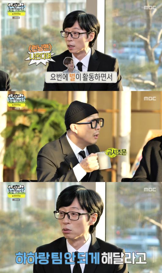 이어 유재석은 “별이 하하랑 같은 팀 안되게 해달라고 했다더라”고 깜짝 폭로했고, 당황한 하하는 “‘런닝맨’ 얘기를 왜 여기서 하냐. ‘런닝맨’가서는 ‘놀면 뭐하니’ 얘기 안한다. 그쪽 애들이 하도 세니까”라고 말했다. 이를 듣던 정준하는 “’런닝맨’이랑 한번 붙자고 했던 건 물 건너 갔냐”고 콜라보에 대해 물었고, 유재석은 “올해 한번 하자”고 긍정적인 답변을 전했다.