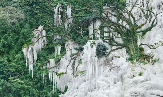 꽁꽁 얼어붙은 하얀 빙벽 사이로 나무 한 그루가 초록의 가지를 뻗고 있다. 그런데 자세히 보면 나무 줄기를 타고 이끼가 자란다. 제주도에나 볼 법한 나무다. 얼음 기둥을 뒤로 한 왼쪽의 언덕은 겨울이 아니라 한 여름 초록의 숲이다. 계절을 알 수 없는 이 기이한 풍경은 대체 어디일까?