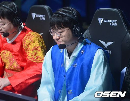 [OSEN=종로, 고용준 기자] 22일 오후 서울 종로 롤파크 LCK아레나에서 ‘2023 LOL 챔피언스 코리아(이하 LCK)’ 스프링 스플릿 한화생명과 리브 샌박의 1라운드 경기가 열렸다. ‘포니’ 임주완 해설이 설을 맞아 전통 한복을 입고 중계에 임하고 있다. / scrapper@osen.co.kr