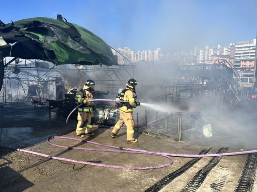 [울산=뉴시스] 박수지 기자 = 24일 오전 11시41분 울산시 울주군 구영리의 비닐하우스에서 화재가 발생했다.