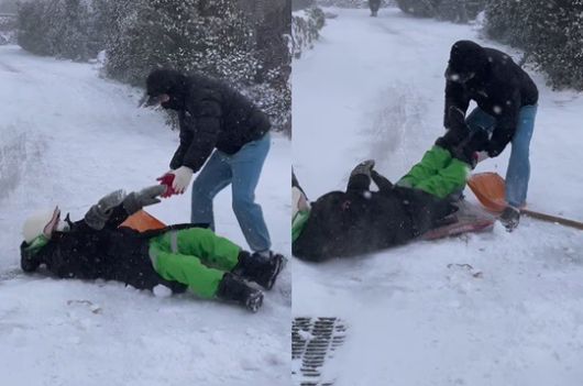 공개한 영상에는 포대자루로 썰매를 만들어 눈이 쌓인 길에서 썰매를 타고 있는 송가인의 모습이 담겨있다.