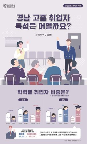 윤 연구위원은 경남에서 2000년 이후 대졸 이상 학력의 취업자 비중이 많이 증가했으나, 2021년 기준 고졸 취업자가 41.9%, 대졸 이상 학력의 취업자가 39.3%로 지역노동시장에서 고졸 취업자의 중요성이 여전히 큰 것으로 나타났다고 밝혔다.