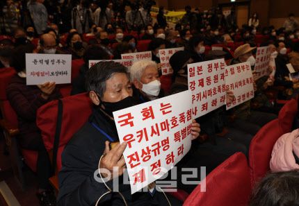 지난 12일 서울 여의도 국회 의원회관에서 열린 강제징용 해법 논의를 위한 공개토론회에서 참석자들이 피켓을 들고 있다. (사진=노진환 기자) |