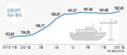 25일 영국 조선·해운 시황 분석기관 클락슨리서치에 따르면 신조선가 지수(Newbuilding Price Index)는 지난 13일 기준 162.43으로 전주 대비 0.23포인트 상승했다. 이는 지난해 1월 말(154.26)과 비교했을 때 5.3% 오른 것으로, 지난해 최고치였던 162.12(2022년 8월 말 기준)보다도 높은 수치다.