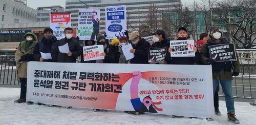 (서울=연합뉴스) 송정은 설하은 기자 = 민주노총과 중대재해없는세상만들기운동본부는 26일 서울 용산구 전쟁기념관에서 기자회견을 열고 중대재해처벌법을 엄정하게 집행해 책임자를 강력히 처벌하라고 요구했다.