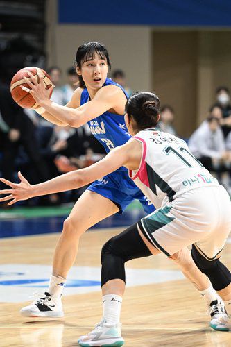 (서울=연합뉴스) 26일 충남 아산이순신체육관에서 열린 신한은행 SOL 2022-2023 여자프로농구 아산 우리은행과 부천 하나원큐 경기에서 우리은행 김단비가 하나원큐 김예진을 상대하고 있다. 이날 김단비는 30점 15리바운드 3블록슛을 기록하며 우리은행의 74-61 승리를 이끌었다. 2023.1.26 [WKBL 제공. 재판매 및 DB금지] photo@yna.co.kr ▶제보는 카카오톡 okjebo▶연합뉴스 앱 지금 바로 다운받기~▶네이버 연합뉴스 채널 구독하기 <저작권자(c)연합뉴스. 무단전재-재배포금지.>