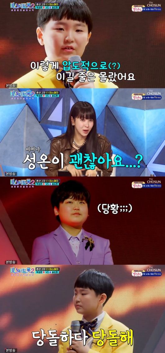 박성온은 '내이름 아시죠'를 어른 못잖은 애절한 감성으로 소화해 눈길을 끌었다. 관객석은 물론 연예인 심사위원단 사이에서도 눈물을 글썽이는 사람이 속출했다.