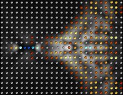 유체역학적 결정의 컴퓨터 시뮬레이션. 유체역학적 결정에서 입자쌍(가장 왼쪽에 있는 오렌지색과 노란색 입자)이 후방에 있는 입자들을 요동시켜 준입자들이 마치 초음속 제트기 뒤에서 볼 수 있는 원뿔 모양으로 퍼지면서 생성된다. *색은 입자쌍의 세기를 의미한다.(이웃한 입자 사이의 거리가 가까운 파란색이 가장 세기가 크고 빨간색, 노랑, 흰색 순으로 거리가 멀어지며 세기가 작아진다) 그리고 흰색의 배경은 이들의 속도를 의미한다. 그림제공=기초과학연구원 |