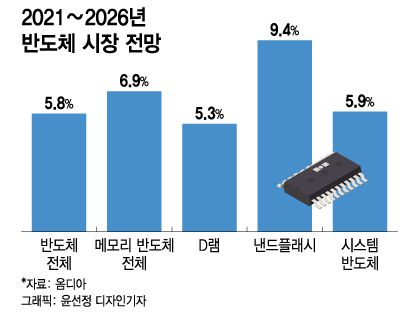 26일 시장조사 업체 옴디아에 따르면 2021∼2026년 메모리반도체의 연평균 성장률은 6.9%에 달할 전망이다. 이는 전체 반도체 시장(5.8%)과 시스템반도체(5.9%)의 연평균 성장률보다도 높은 수치다. 메모리 반도체 중에서도 가장 높은 성장률을 보일 것으로 예상되는 제품군은 낸드플래시다. 낸드플래시의 해당 기간 연평균 성장률은 9.4%에 달한다. 5G(5세대) 이동통신, AI(인공지능) 등 첨단 산업이 모두 대량의 데이터 처리를 해야 하는 만큼 메모리 반도체의 수요가 늘어날 수밖에 없다는 게 이런 전망의 배경이다. 낸드의 경우 경쟁사 중 최근엔 삼성전자 정도만이 의미 있는 수익을 내는 것으로 알려져 있다.