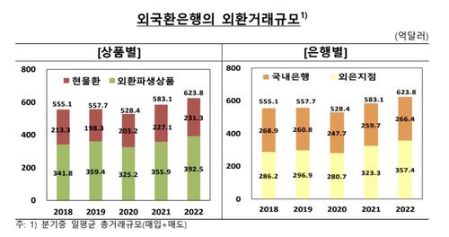 한국은행이 27일 발표한 '2022년 중 외국환은행의 외환거래 동향'에 따르면 지난해 외국환은행의 1일 평균 외환거래(현물환·외환파생상품 거래) 규모는 623억8천만달러로 집계됐다.