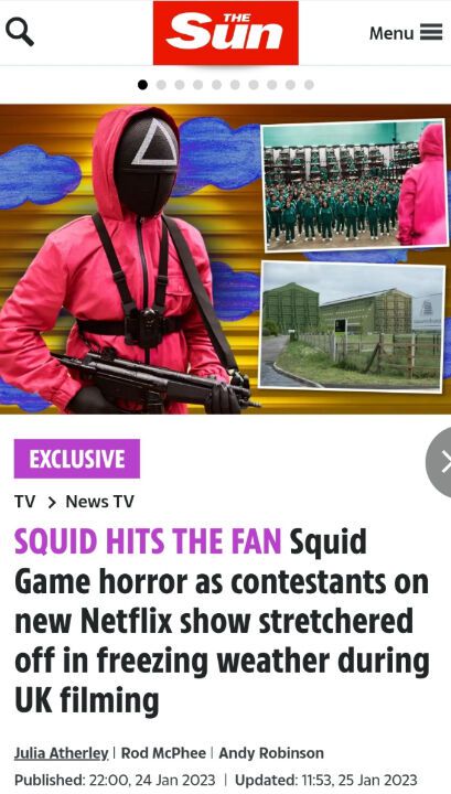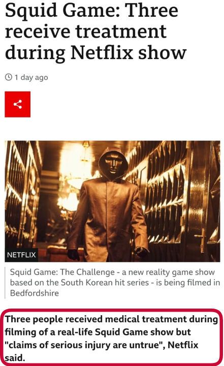 2021년, 전 세계를 강타한 넷플릭스 드라마 '오징어 게임'에서 영감을 얻은 영국에서 리얼리티 쇼를 제작 중인 가운데, 촬영 중 참가자 여러 명이 다쳤다는 주장이 현지 매체에 실렸습니다.