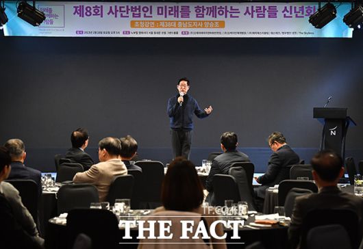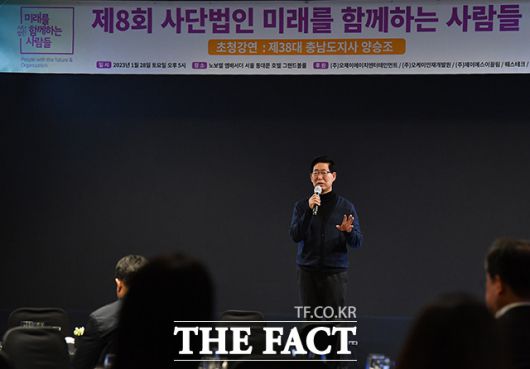 [더팩트ㅣ박헌우 기자] 제8회 '사단법인 미래를 함께하는 사람들' 신년회가 28일 오후 서울 중구 노보텔 앰배서더 서울 동대문 호텔에서 열린 가운데 양승조 전 충남도지사가 강연을 하고 있다.