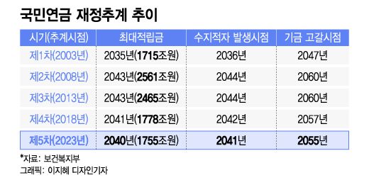 [머니투데이 정현수 기자] [편집자주] 보건복지부가 지난 27일 국민연금 고갈시점(2055년)이 담긴 재정추계 결과를 발표했다. 급격한 저출산 현상으로 5년 전과 비교해 2년이나 앞당겨졌다. 과거 정부가 연금개혁을 외면한 만큼 국민연금의 재정 상황도 악화됐다. 당장 연금개혁이 이뤄지지 않는다면 미래세대의 부담은 커질 수밖에 없다. 국민연금 재정추계에 담긴 숫자들의 의미를 짚어봤다.