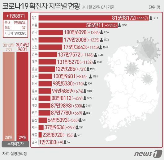 (서울=뉴스1) 김초희 디자이너 = 30일 질병관리청 중앙방역대책본부에 따르면 이날 0시 기준 국내 코로나19 누적 확진자는 1만8871명 증가한 3014만9601명으로 나타났다. 신규 확진자 1만8871명(해외유입 37명 포함)의 신고 지역은 서울 2924명, 부산 1225명, 대구 1132명(해외 2명), 인천 1145명(해외 18명), 광주 669명(해외 1명), 대전 500명, 울산 565명, 세종 156명, 경기 4447명(해외 5명), 강원 439명, 충북 674명(해외 1명), 충남 731명, 전북 816명, 전남 710명, 경북 1146명, 경남 1286명, 제주 297명(해외 1명), 검역 과정 9명이다.
