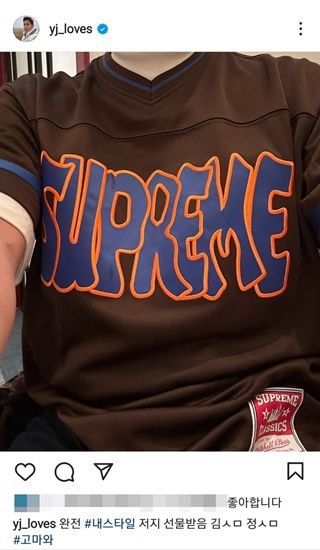 [서울=뉴시스] 이혜원 기자 = 최근 정용진 신세계그룹 부회장이 갈색 계열의 저지를 입고 찍은 사진을 SNS 개인 계정에 올려 화제다. 정 부회장이 "내 스타일 저지"라며 입은 상의는 지난해 가을·겨울(FW) 시즌 글로벌 패션브랜드 슈프림과 미첼앤네스가 협업해 제작한 풋볼 저지다.