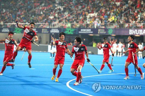 아르헨티나를 꺾고 8강행을 확정한 한국 남자하키 대표팀. |