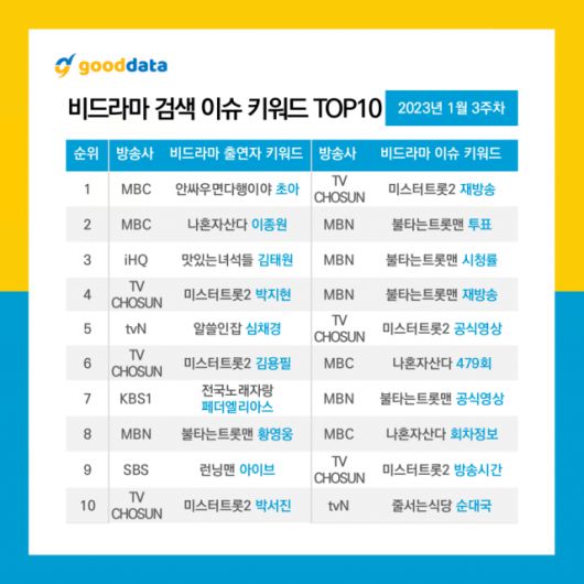 30일 TV조선 예능프로그램 '미스터트롯2-새로운 전설의 시작'(이하 '미스터트롯2') 측에 따르면, 한국방송콘텐츠 경쟁력 분석 전문 기관 굿데이터코퍼레이션의 조사 결과 1월 3주차 '비드라마 화제성 TOP10'에서 3주 연속 1위에 올랐다. 아울러 출연자 박지현, 김용필, 박서진이 2주 연속 드라마를 제외한 '검색 이슈 키워드 TOP10'에 속했다. 역대 최단 시간 올하트로 방송 시작과 동시에 화제의 인물에 등극한 박지현은 5주 연속 상위권에 이름을 올려 넘치는 스타성을 다시 한번 확인시켰다.