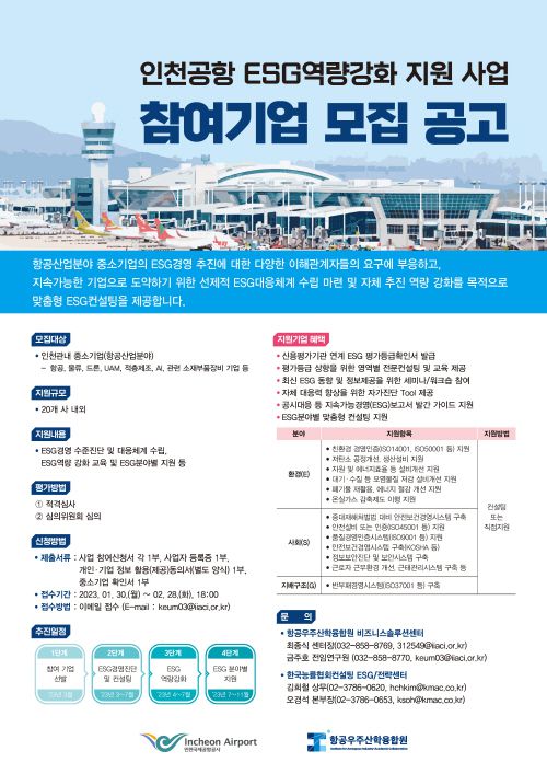 인천국제공항공사는 오는 2월 28일까지 항공산업분야 중소기업의 ESG 경영 활성화를 위한 'ESG 역량강화 지원사업(ESG100)'에 참여할 중소기업을 모집한다고 31일 밝혔다.