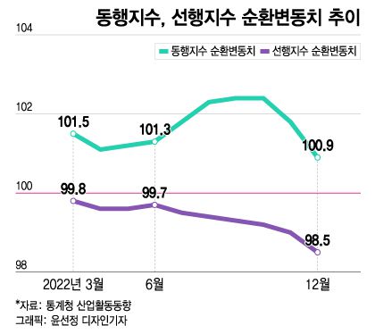 현재 경기 흐름을 나타내는 12월 동행지수 순환변동치는 100.9로 전월 대비 0.9포인트(p) 하락했다. 이러한 하락폭은 2020년 4월(-1.2포인트) 이후 32개월 만에 가장 크다. 향후 경기를 예측하는 선행종합지수 순환변동치는 98.5로 전월 대비 0.5포인트 하락했다. 선행종합지수 순환변동치는 7월 -0.2% 이후 6개월 연속 하락세를 보이고 있다.