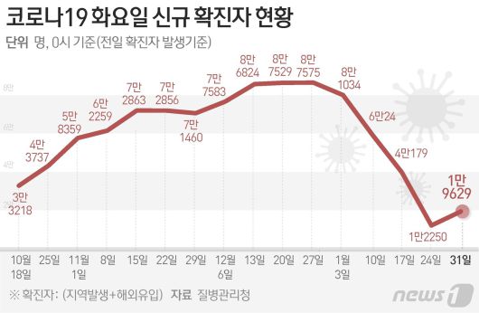 (서울=뉴스1) 김초희 디자이너 = 질병관리청 중앙방역대책본부(방대본)는 31일 0시 기준 신종 코로나바이러스 감염증(코로나19) 신규 확진자가 1만9629명 발생했다고 밝혔다.a_a@news1.krCopyright ⓒ 뉴스1. All rights reserved. 무단 전재 및 재배포 금지.