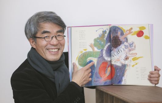 극작가 배삼식이 자신의 첫 희곡 그림책 ‘훨훨 올라간다’에서 뒷산이 돼 잠들어 있던 전설 속 동물들이 깨어나 하늘로 돌아가려 하는 장면을 펼쳐 보이고 있다. 그는 “아이들이 역할을 나눠 읽으며 함께 즐겁게 놀기를 바라면서 쓴 이야기”라고 했다. /박상훈 기자 |