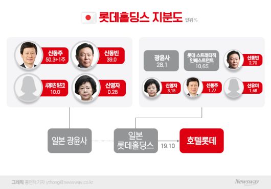 일본 롯데홀딩스의 최대주주인 광윤사의 경우 신동주 회장이 지분 50.3%를 보유하고 있고, 신동빈 회장이 39%, 고 신격호 명예회장의 부인 시게미츠 하츠코 여사가 10%를 갖고 있다.