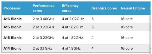 일단 사양을 통해 프로세서의 차이점을 확인하자.이제 각 프로세서의 성능을 살펴보자. 당연히 아이폰 14 프로의 A16 바이오닉이 가장 빠르다. 아이폰 14와 아이폰 13에는 모두 A15 바이오닉 프로세서가 들어갔는데, 아이폰 13은 아이폰 13 프로보다 GPU 수가 하나 적어서 그만큼 그래픽 성능 차이가 발생한다.
