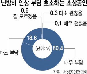 2일 소상공인연합회가 발표한 긴급 실태조사(1월 30일~2월 1일) 결과에 따르면 소상공인 1811명 중 99%는 난방 비용이 부담된다고 답했다. ‘매우 부담’은 80.4%, ‘다소 부담’은 18.6%였다. 숙박업 및 욕탕업의 경우 ‘매우 부담’ 응답이 각각 98.5%, 90.0%에 달해 특히 심각했다.