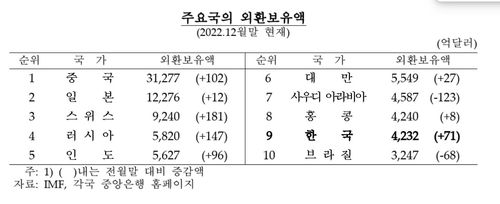 한국의 외환보유액 규모는 12월 말 기준(4천232억달러)으로 세계 9위 수준이다.