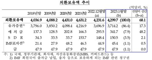 한은이 3일 발표한 외환보유액 통계에 따르면 1월 말 기준 외환보유액은 4천299억7천만달러(약 526조5천억원)로, 작년 12월 말(4천231억6천만 달러)보다 68억1천만달러 증가했다.