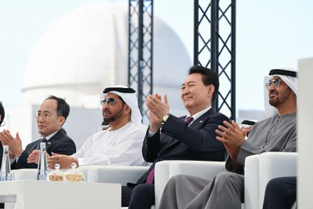 아랍에미리트(UAE)를 국빈 방문 중인 윤석열 대통령이 지난달 16일(현지시간) 바라카 원자력발전소에서 열린 바라카 원전 3호기 가동식에서 무함마드 빈 자예드 알 나흐얀 UAE 대통령 등 참석자들과 박수치고 있다. (사진=연합뉴스) |