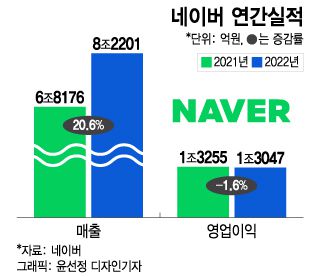 네이버는 2022년 4분기 연결기준 매출 2조2717억원, 영업이익 3365억원을 기록했다고 3일 발표했다. 매출은 전년 동기 대비 17.8% 늘었지만, 영업이익은 4.2% 줄었다. 지난해 연간 매출은 전년 대비 20.6% 증가한 8조2201억원으로 사상 첫 '8조 클럽'에 가입했다. 반면 연간 영업이익은 1.6% 감소한 1조3047억원에 그쳤다. 네이버 영업이익이 줄어든 건 2018년 이후 처음이다.