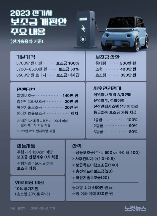 환경부가 지난 2일 '2023년 전기차 구매보조금 개편방안'을 공개했다. 보조금이 100% 지급되는 기본가격 기준을 5500만 원에서 5700만 원으로 상향조정하며, 직영 정비센터와 정비 이력 전산관리시스템 구축 여부에 따라 1~3등급으로 나눠 보조금을 차등 지급한다.