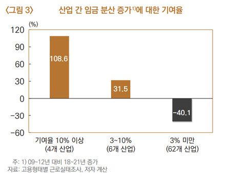 보고서는 “금융위기 이후 완만한 임금분산 상승 추세를 분해해 보니, 동일 산업 내 임금 분산은 줄어든 반면 산업 간 임금 격차 요인이 증가했다”며 “임금분포 양 끝단에 있는 10개 산업이 산업 간 임금 분산 증가를 대부분 설명한다”고 설명했다.